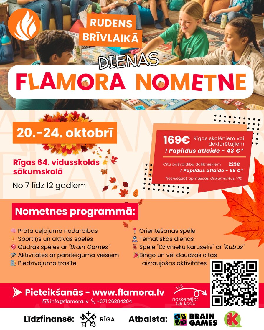 No 20.līdz 24.oktobrim Rīgas 64.vidusskolas sākumskolā notiks izglītojošā un aktīvās atpūtas nometne “FLAMORA NOMETNE”, kurā aicinām pieteikties dalībniekus no 7 līdz 12 gadu vecumam.